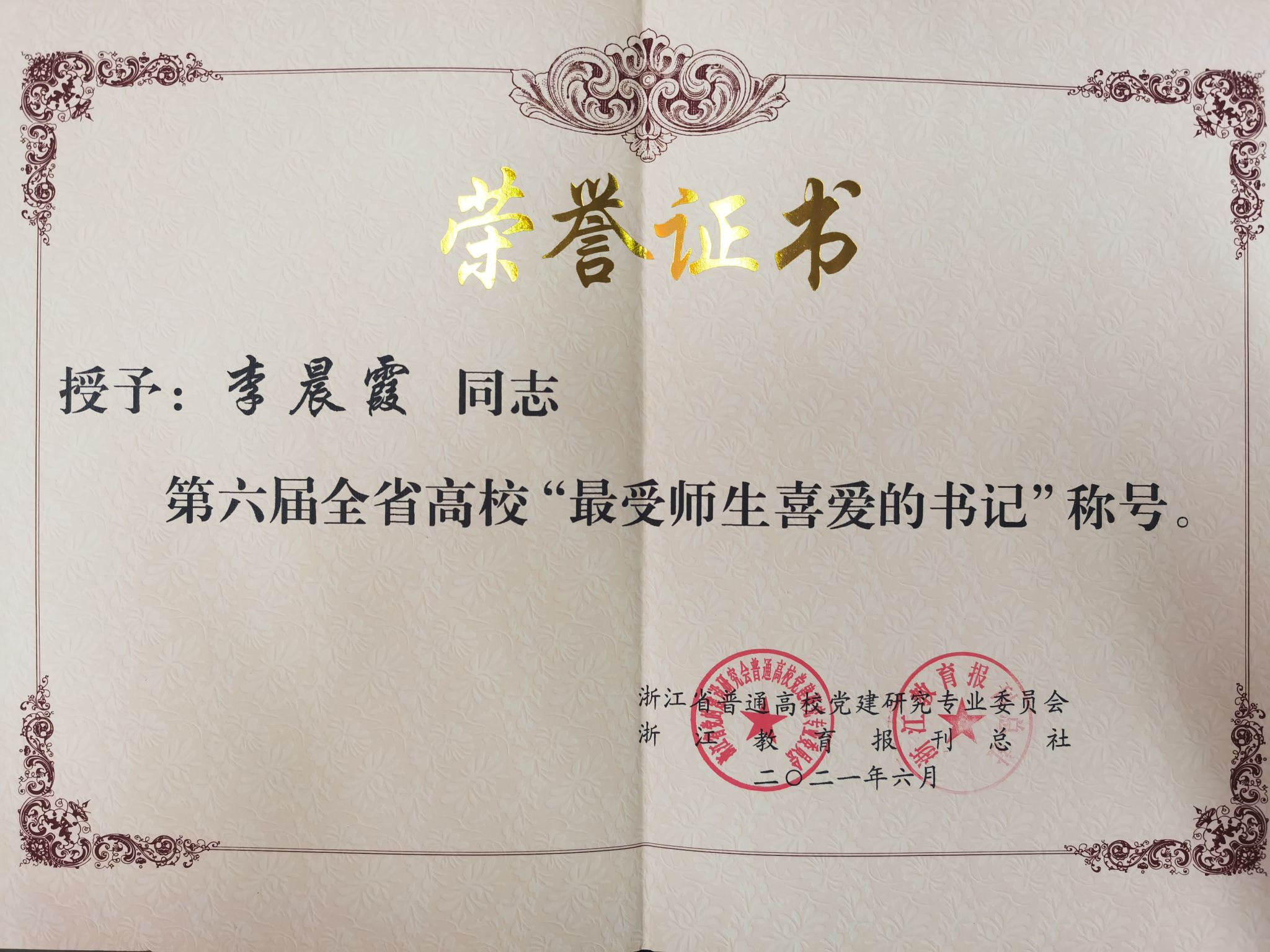 根据全省教育系统庆祝中国共产党成立100周年系列活动和党史学习教育安排,为充分发挥先进典型的示范引领作用,选树一批模范传承红色基因、践行初心使命的高校基层党组织书记,经浙江省教育厅同意,省普通高校党建研究专业委员会、浙江教育报刊总社组织开展了第六届全省高校“最受师生喜爱的书记”选树宣传活动。我校光电学院光科系“双带头人”教工党支部书记李晨霞同志在近百名人选中脱颖而出,荣获第六届全省高校“最受师生喜爱的书记”称号,全省高校仅10名同志入选。全体党支部书记要以“最受师生喜爱的书记”为榜样,深入学习贯彻习近平新时代中国特色社会主义思想,始终不忘为党育人、为国育才的初心和使命,坚决贯彻上级决策部署,不断加强党组织自身建设,持续推动学校党建工作跃迁升级,向党的百年华诞献礼。