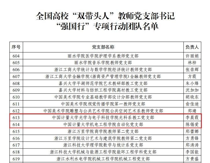 近日,教育部思想政治工作司印发了《关于公布全国高校“双带头人”教师党支部书记“强国行”专项行动团队名单的通知》,经严格评审与层层筛选,我校光学与电子科技学院光科系教工党支部书记李晨霞工作室和机电工程学院自动化党支部书记陈锡爱工作室成功入选,实现了本年度党建“双创”工作又一新的突破。